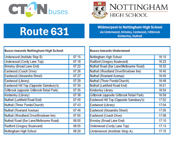 - Journeys to Nottingham High School are timed to arrive by 08:20, please check the times below to ensure you do not miss the bus.